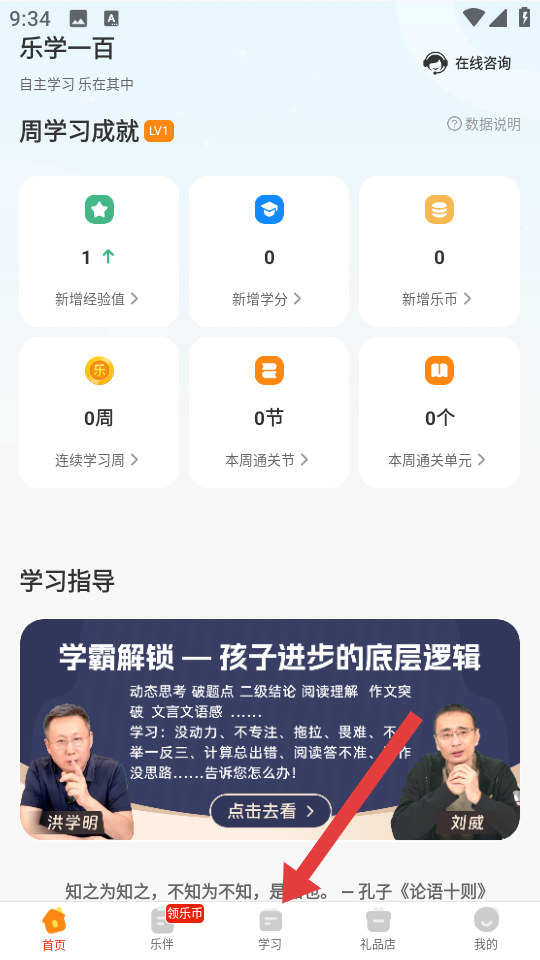 1、打開樂學(xué)一百APP,點(diǎn)擊底部導(dǎo)航欄中的【學(xué)習(xí)】選項。