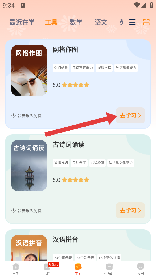 2、在【學(xué)習(xí)】頁面里,找到想要學(xué)習(xí)的課程,如【網(wǎng)格作圖】,點(diǎn)擊【去學(xué)習(xí)】。