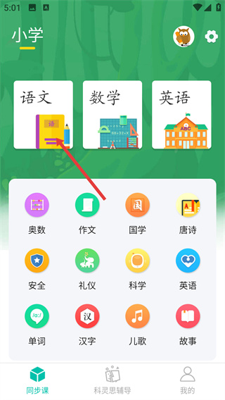 1、進入小學(xué)同步課APP首頁,點擊【語文】科目,進入語文課程頁面。