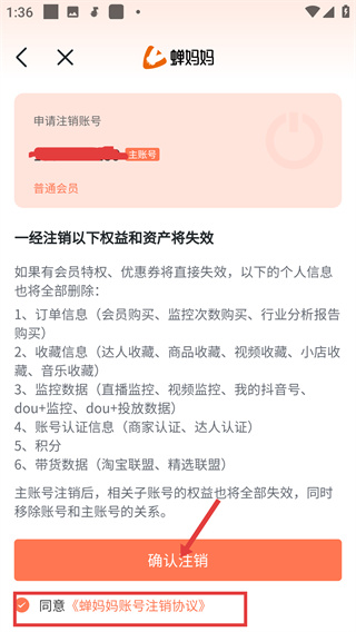 4、在賬號注銷頁面勾選【同意《蟬媽媽賬號注銷協議》】后,點擊【確認注銷】,完成賬號注銷操作。