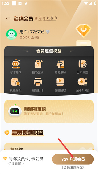 3、在會(huì)員中心頁(yè)面選擇【海綿會(huì)員-月卡會(huì)員】,點(diǎn)擊【¥29開通會(huì)員】,進(jìn)入結(jié)算頁(yè)面。