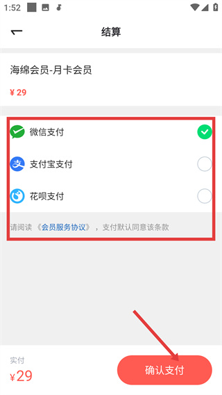 4、在結(jié)算頁(yè)面選擇支付方式,點(diǎn)擊【確認(rèn)支付】,完成海綿會(huì)員開通操作。
