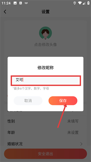 4、在【修改昵稱】彈窗的輸入框中填寫符合要求的新昵稱后,點(diǎn)擊【保存】按鈕完成昵稱的修改操作。