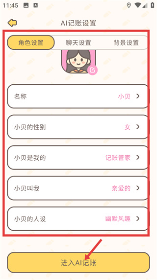 3、在記賬設(shè)置頁面完成角色信息、聊天、背景設(shè)置后,進(jìn)入記賬的交互操作頁面。