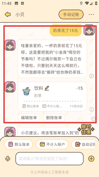 4、在記賬交互頁面輸入消費(fèi)內(nèi)容,角色會自動(dòng)識別并生成對應(yīng)賬單,完成記賬,還可對賬單進(jìn)行編輯或刪除。