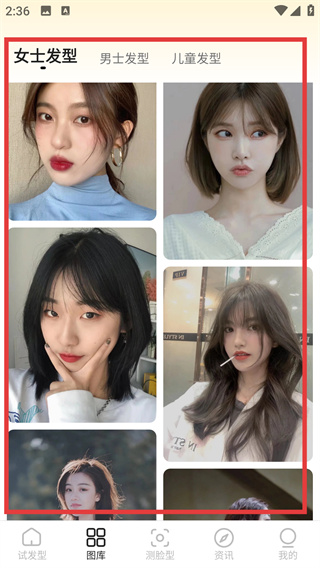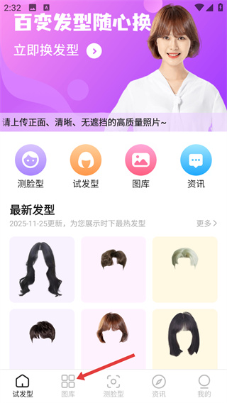 1、在APP首頁點擊底部【圖庫】按鈕,進入發(fā)型圖庫頁面,可查看不同類別的發(fā)型樣式。