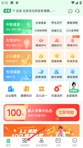 1、在APP首頁點(diǎn)擊底部【全部服務(wù)】按鈕,進(jìn)入全部服務(wù)頁面,可瀏覽各類養(yǎng)生服務(wù)的分類與項(xiàng)目。
