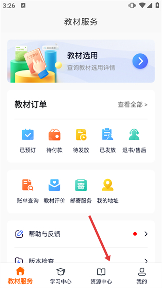 1、在教材服務(wù)頁(yè)面,點(diǎn)擊底部導(dǎo)航欄的【資源中心】選項(xiàng),進(jìn)入資源中心界面,可查看各類(lèi)學(xué)習(xí)資源入口。