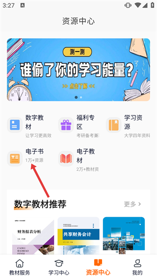 2、在資源中心頁(yè)面,選擇【電子書(shū)】選項(xiàng),進(jìn)入電子書(shū)界面,該板塊提供1萬(wàn)+資源供查閱。