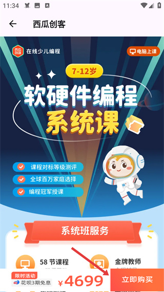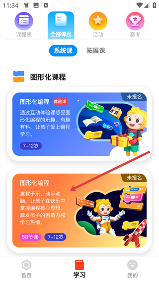 1、在學(xué)習(xí)頁面的全部課程板塊,點擊【圖形化編程-58節(jié)課】課程條目,進入該課程的詳情介紹頁面。