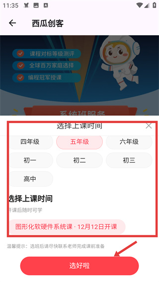 3、在選擇上課時間頁面選定對應(yīng)年級與【圖形化軟硬件系統(tǒng)課-12月12日開課】時段后,點擊【選好啦】按鈕推進流程。