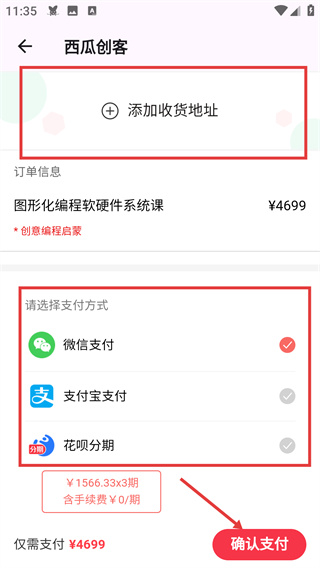 4、在訂單頁面點擊【添加收貨地址】完善信息,選定支付方式后,點擊【確認支付】完成課程購買流程。