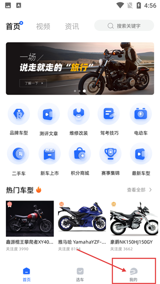 1、在APP的【首頁】,可瀏覽【品牌車型】【熱門車型】等摩托車相關(guān)內(nèi)容,若需進入個人中心,點擊底部導(dǎo)航欄的【我的】選項。