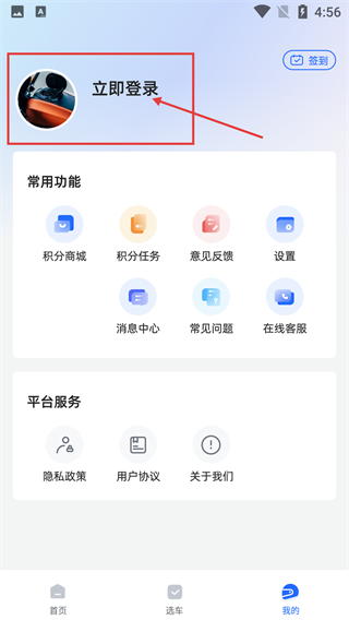 2、進入【我的】頁面后,若未登錄會顯示【立即登錄】區(qū)域,點擊該區(qū)域可進入登錄界面,頁面還包含【積分商城】等常用功能入口。