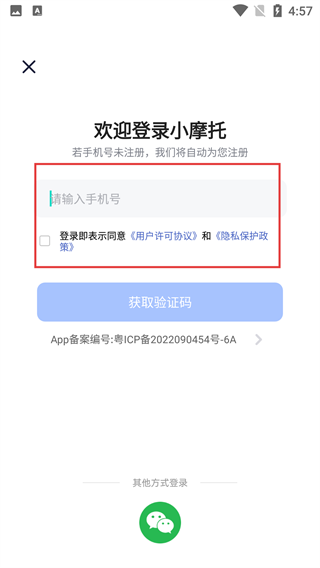 3、進入【歡迎登錄小摩托】界面后,需先在【請輸入手機號】框填寫信息,點擊【獲取驗證碼】。