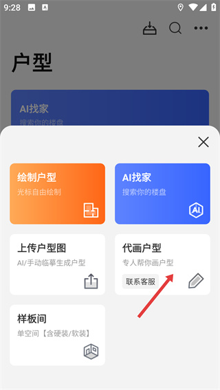 3、在功能菜單中選擇【代畫戶型】選項,進(jìn)入由專人協(xié)助繪制戶型的服務(wù)流程入口。