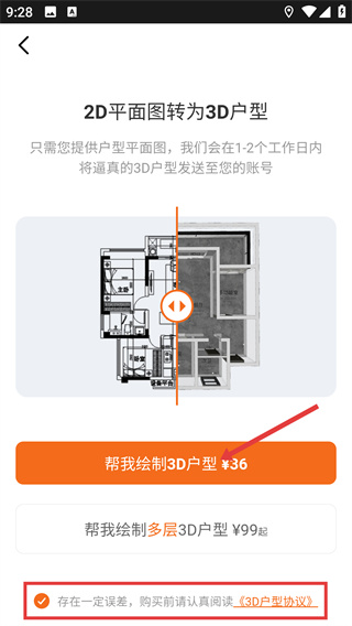 4、在代畫戶型的服務(wù)頁面,勾選協(xié)議后點擊【幫我繪制3D戶型¥36】按鈕,即可發(fā)起2D轉(zhuǎn)3D戶型的繪制服務(wù)。