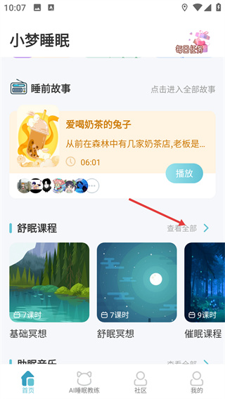1、在【小夢(mèng)睡眠】首頁找到【舒眠課程】板塊,點(diǎn)擊右側(cè)“查看全部”,進(jìn)入課程列表頁面。