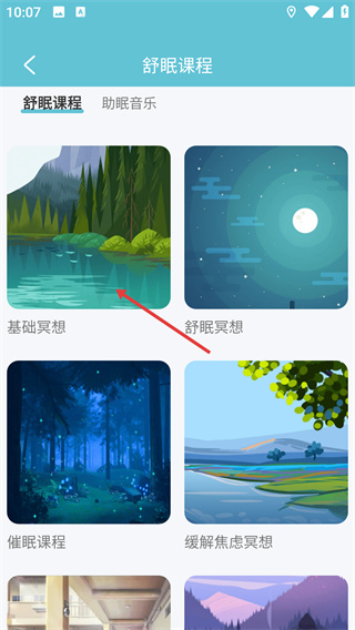 2、在舒眠課程列表中選擇【基礎(chǔ)冥想】課程,進(jìn)入該課程的章節(jié)詳情頁面。