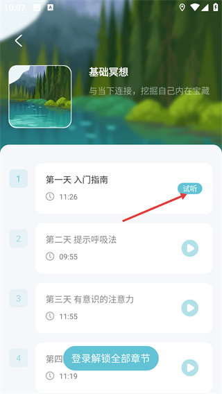 3、在基礎(chǔ)冥想的章節(jié)列表中,點(diǎn)擊【第一天 入門指南】右側(cè)的“試聽”按鈕,進(jìn)入課程播放界面。