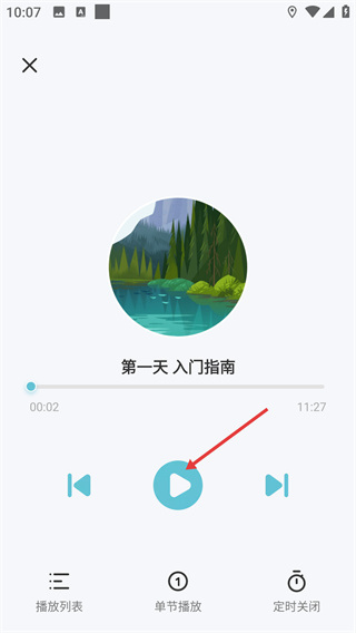 4、在課程播放界面,點(diǎn)擊中間的播放按鈕即可開始收聽課程,還可使用定時(shí)關(guān)閉等功能。