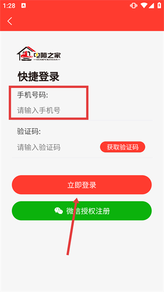 4、在快捷登錄頁面,在“手機號碼”輸入框填寫目標手機號,點擊“獲取驗證碼”,填寫收到的驗證碼后,點擊“立即登錄”按鈕,完成賬號登錄操作。