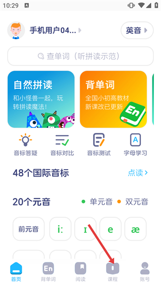1、進(jìn)入英語(yǔ)學(xué)習(xí)軟件首頁(yè)后,點(diǎn)擊底部導(dǎo)航欄的【課程】選項(xiàng),即可切換至課程選擇頁(yè)面,準(zhǔn)備選取目標(biāo)學(xué)習(xí)課程。