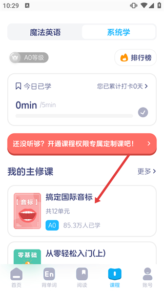 2、在課程頁(yè)面中,找到【搞定國(guó)際音標(biāo)】課程條目,其為A0等級(jí)主修課且85.3萬(wàn)人已學(xué),點(diǎn)擊可進(jìn)入課程詳情頁(yè)。