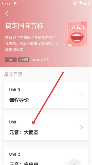 3、進(jìn)入【搞定國(guó)際音標(biāo)】課程詳情頁(yè)后,在單元目錄選擇【Unit-1-元音:大而圓】單元,點(diǎn)擊進(jìn)入該單元學(xué)習(xí)頁(yè)面。