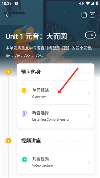 4、進(jìn)入【Unit-1-元音:大而圓】單元頁(yè)面后,在“預(yù)習(xí)熱身”板塊點(diǎn)擊【單元綜述】,可了解本單元學(xué)習(xí)內(nèi)容概述。