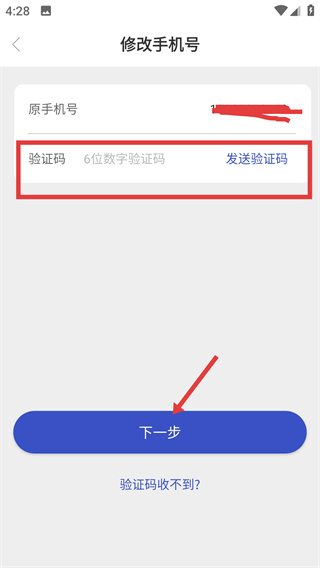 4、在【修改手機號】頁面,先點擊【發(fā)送驗證碼】獲取【6位數(shù)字驗證碼】填入,再點擊【下一步】繼續(xù)完成修改。