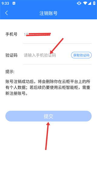 4、在注銷賬戶頁(yè)面,獲取并輸入手機(jī)驗(yàn)證碼后,點(diǎn)擊“提交”按鈕,完成賬號(hào)注銷。