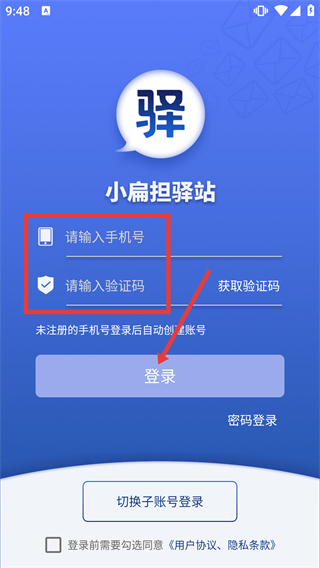 1、在小扁擔(dān)驛站的登錄頁面,輸入手機(jī)號、獲取并填寫驗證碼,勾選同意《用戶協(xié)議、隱私條款》后,點擊“登錄”按鈕,進(jìn)入驛站首頁。