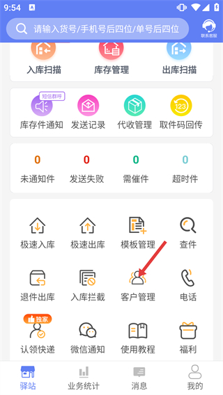 2、在驛站首頁的功能區(qū)域中,找到并點擊“客戶管理”選項,進(jìn)入客戶管理頁面,該頁面支持客戶分組、通訊錄等信息的管理。