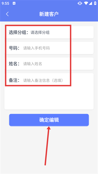 4、在新建客戶頁面,選擇目標(biāo)客戶分組,填寫手機(jī)號、姓名等信息(備注為選填項),完成后點擊“確定編輯”按鈕,完成新客戶的添加操作。