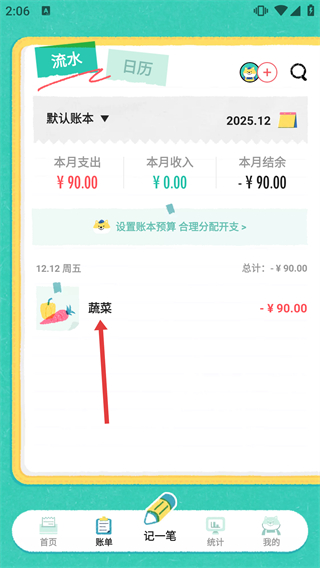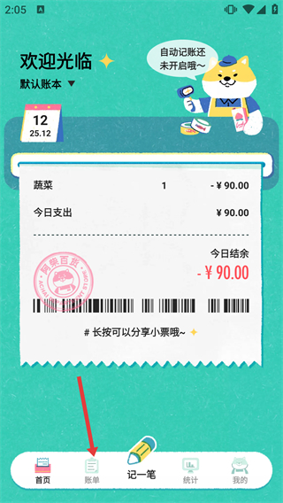 1、在記賬APP首頁,點擊底部導(dǎo)航欄的【賬單】選項,進入流水賬單頁面,可查看本月收支統(tǒng)計及具體賬單記錄。