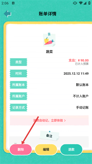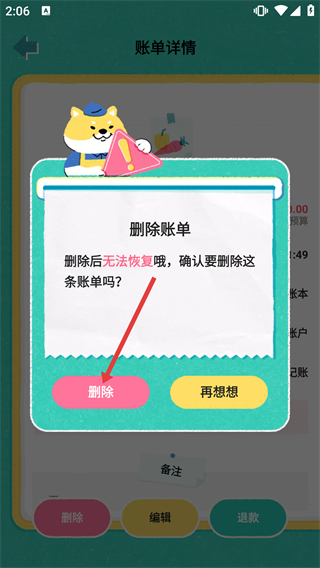 3、在賬單詳情頁面,點擊底部的【刪除】按鈕,觸發(fā)【刪除賬單】確認(rèn)彈窗,彈窗會提示“刪除后無法恢復(fù)”的注意事項。