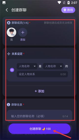 4、進入【創(chuàng)建群聊】頁面,需完善【群聊成員】、【關(guān)系設(shè)定】、【群聊信息】,完成后點擊【創(chuàng)建群聊】按鈕生成群聊。