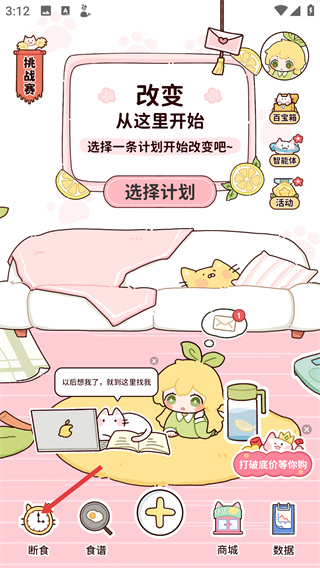 1、在主界面點(diǎn)擊底部【斷食】按鈕,進(jìn)入計(jì)劃選擇頁,通過【選擇計(jì)劃】按鈕可查看專屬或輕斷食計(jì)劃,開啟改變流程。