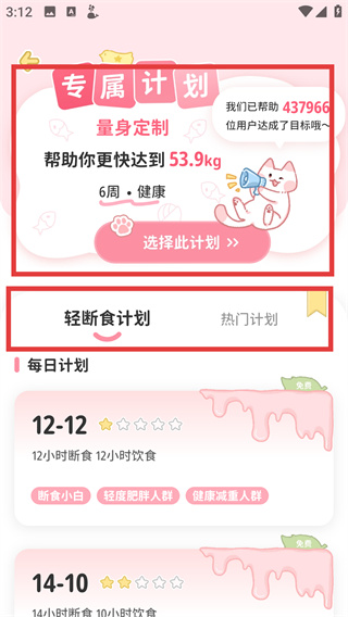 2、進(jìn)入計(jì)劃選擇頁后,可查看【專屬計(jì)劃】及【輕斷食計(jì)劃】。