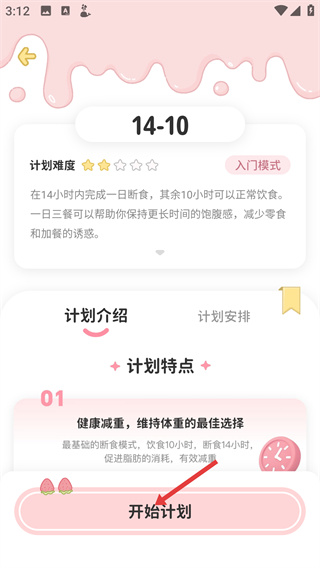 3、進(jìn)入【14-10】計(jì)劃詳情頁,查看其【入門模式】特點(diǎn)后,點(diǎn)擊底部【開始計(jì)劃】按鈕,即可啟動(dòng)該斷食計(jì)劃。