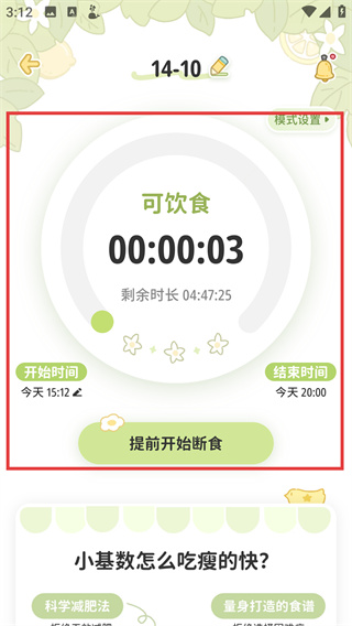 4、啟動(dòng)計(jì)劃后進(jìn)入計(jì)時(shí)頁,可查看【可飲食】時(shí)長(zhǎng)及剩余時(shí)間,也能點(diǎn)擊【提前開始斷食】按鈕調(diào)整流程。