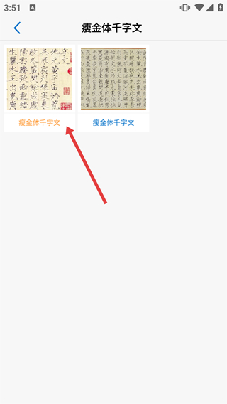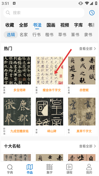 1、在書法APP的【作品】頁面,選擇“書法”分類,在熱門區(qū)域點(diǎn)擊《瘦金體千字文》作品條目,進(jìn)入該作品的選集頁面。