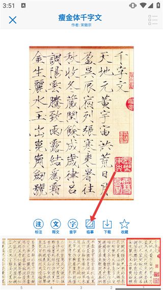 3、在《瘦金體千字文》詳情頁,點(diǎn)擊底部的【臨摹】按鈕,進(jìn)入該作品的臨摹操作界面,開啟書法臨摹練習(xí)。