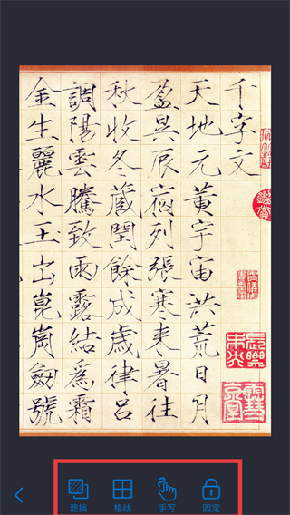 4、進(jìn)入臨摹界面后,可利用底部的“遮擋”“格線”“手寫”“固定”等輔助工具,優(yōu)化臨摹練習(xí)的體驗(yàn)與效果。