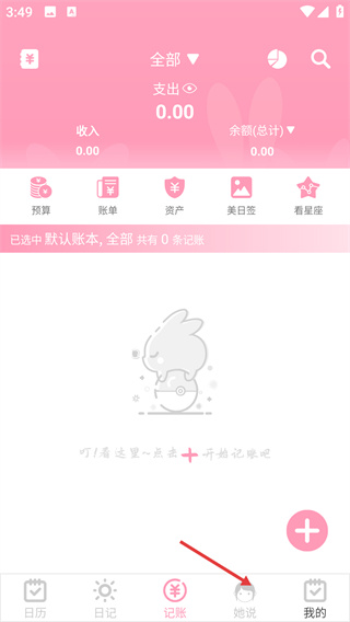 1、在記賬頁面,點擊底部【她說】選項,進入內(nèi)容互動頁面,為后續(xù)發(fā)帖做準(zhǔn)備。