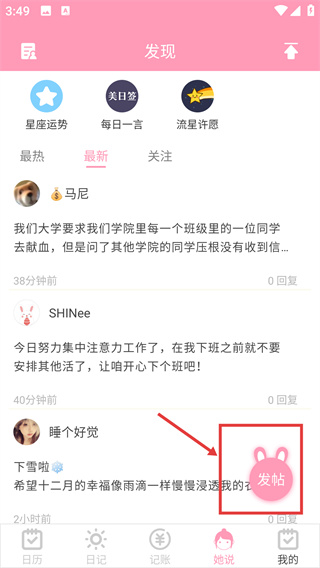 2、在【她說】頁瀏覽動態(tài)內(nèi)容后,點擊【發(fā)帖】按鈕,進入帖子編輯頁面,可開始創(chuàng)作個人分享內(nèi)容。