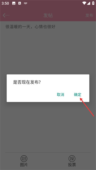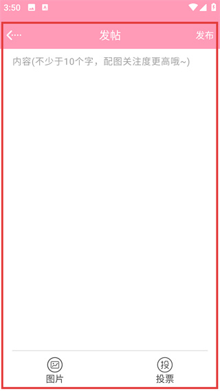 3、進入發(fā)帖編輯頁后,在內(nèi)容框填寫不少于10字的內(nèi)容,還能使用【圖片】、【投票】功能,豐富帖子的呈現(xiàn)形式。