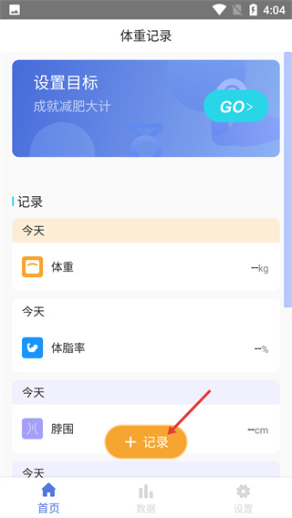 1、在體重記錄頁找到【+記錄】按鈕并點擊,進入身體指標(biāo)編輯頁面,可準(zhǔn)備填寫體重、體脂率等數(shù)據(jù)。