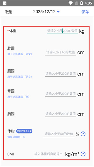 2、進入編輯頁后,按提示填寫【體重】、【脖圍】等指標(biāo),各項數(shù)值需符合頁面標(biāo)注的輸入范圍,確保數(shù)據(jù)有效。